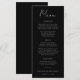 Cette carte de menu mariage présente un script de calligraphie contemporain captivant. Le design noir et blanc crée une première impression audacieuse et inoubliable, tandis que les éléments du menu sont élégamment exposés, afin que vos invités puissent anticiper avec impatience les délices culinaires de votre réception de mariage.