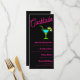 Ce menu personnalisé d'événement ou de fête comporte un thème néon de signe sur un arrière - plan noir. Le titre "Cocktails" est imprimé sur le dessus dans une police de script rose néon. Une boisson de style martini avec un citron est placée ci-dessous, suivie d'une variété de boissons et d'ingrédients de cocktails.