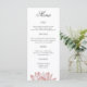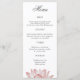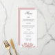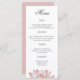 Simple, élégant et informatif. Vous apprécierez la disposition soignée et la facilité de lecture du texte de ce menu mariage. Un seul motif floral lotus au fond. Cela fait partie de notre collection florale rose vif d'articles assortis et coordonnés pour votre mariage. Prenez un moment et parcourez plus loin notre collection. Espace pour quatre cours. Soyez concis et gardez chacune à trois lignes. Si vous avez besoin d'espace supplémentaire, contactez le concepteur qui peut vous aider avec la disposition. L'inverse est un rose pâle foncé coordonné.