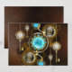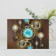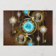 Turquoise lenses with antique watch with brass gears and golden keys on rusty, brown background. Steampunk style.