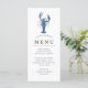 Menus de nourriture personnalisés sur le thème du homard bleu pour votre prochaine fête du homard ou événement de fruits de mer. Il présente une illustration de style aquarelle d'un homard bleu. En dessous, il y a des espaces pour les informations de menu de votre événement.