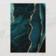 Cet élégant menu mariage moderne comprend une bordure turquoise en aquarelle bleue ornée d'une parties scintillant en faux or. Le texte personnalisable combine le script d'écriture manuscrite gris charbon et les polices sans serif sur un arrière - plan blanc. Le design turquoise et or agate est répété à l'envers.