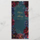Un menu mariage à bijou rouge, vert et bleu avec un bleu turquoise, bleu saphir et un bordeaux bordeaux aux reflets roses framboises dans une symphonie de tons bijoux profonds ornés d'un spray doré chatoyant et de contours dorés sur un arrière - plan d'aquarelle turquoise profonde. Un calque opaque permet aux graphiques d'afficher à travers le menu écrit en script noir pour les en-têtes et le même coque supérieur pour les options de menu.
