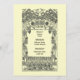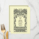 Il s'agit d'un imprimé d'un menu vintage de dîner mariage Art nouveau dessiné à la main, avec des oiseaux, des arbres fruitiers, des vignes, du blé et du poisson à l'avant et des cloches mariages à l'arrière. La couleur arrière - plan peut être customisée et le texte peut être personnalisé.