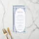 Un menu élégant à l'air vintage, à conseiller pour une mariage aux couleurs mariage bleu et blanc poussiéreux. Le menu est vintage et orné. Le titre "Menu" et les sous-titres sont écrits en casquette. Tout le texte peut être personnalisé. Le texte et le cadre vintage sont bleu poussiéreux, l'arrière - plan est blanc. Au fond, on retrouve le même cadre ancien, mais blanc sur un arrière - plan bleu poussiéreux. Le cadre vintage et orné est basé sur une reliure de livre française antique, par Georges Mercier (1885-1939) - Madame de Maupin par Theophile Gautier, édition 1911, maintenant dans le domaine public.