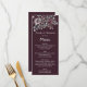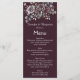 This wedding menu features a rich wine background that sets an elegant, romantic tone. At the top, a lush floral arrangement bursts with soft wine, dusty lavender, creamy whites, and muted greens, adding a touch of vintage charm. The layout is vertically aligned and neatly divided into four sections, each spaced for clarity and balance. Delicate serif typography in a pale hue contrasts beautifully with the dark backdrop, giving the design a refined, timeless feel. The overall aesthetic blends Southern warmth with upscale flair—perfect for a celebration that’s both heartfelt and stylish.