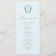 Ce menu de mariage élégant présente une simple crête monographique avec les initiales de la mariée et du marié. Le mot "Menu" est défini dans le script de calligraphie. Utilisez les champs modèle pour ajouter vos éléments de menu personnalisés en turquoise sur un arrière - plan bleu pâle. Parfait pour les mariages, les dîners de répétition, les fêtes de fiançailles et plus encore.