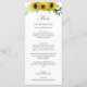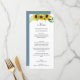 Menu, présentant un design floral moderne et romantique avec des tournesols à l'aquarelle jaune et un dos bleu joues avec un avant blanc.