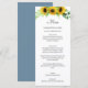 Menu, présentant un design floral moderne et romantique avec des tournesols à l'aquarelle jaune et un dos rose bleu avec un avant blanc.