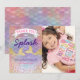 Cartes de remerciement d'anniversaire sous la mer avec une photo de votre enfant, un fond à motif de coquille Saint-Jacques pastel coloré, paillettes dorées et roses, algues, deux queues de sirène pailletées d'or, et un modèle de remerciement pour fête d'enfants facile à personnaliser.