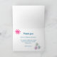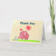 Une carte de vœux fantaisiste avec un éléphant rose debout sur de l'herbe verte brillante reniflant des fleurs de marguerite avec un soleil rose vif au-dessus et un petit cœur rouge mignon symbolisant son bonheur et sa joie. Le texte dit merci en grosses lettres grasses. À l'intérieur, il y a un message de remerciement qui peut être personnalisé. Plus de fleurs et une illustration de soleil rose sont également à l'intérieur de la carte.