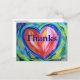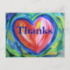 Le message de la carte postale indique : « Merci ». La peinture présente un cœur rouge coloré avec des reflets blancs et des accents dorés. Le cœur est contourné de bleu et a un fond vert doux. Cette peinture de cœur est un hommage au fait de garder l'espoir dans son cœur lorsque les tristes bleus vous entourent, mais de persévérer pour un renouveau vert.