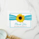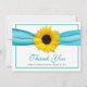 Fleur de tournesol jaune avec carte de remerciements plat ruban bleu aqua. Une combinaison de couleurs joyeuse pour un printemps ou un été et la carte de remerciements parfaite pour un mariage à thème tournesol ou un mariage à thème aqua bleu et blanc où vous voulez ajouter des touches de jaune. Le texte et la couleur arrière - plan de ce faire-part de mariage sont entièrement personnalisables. Pour modifier le texte, utilisez l'option personnaliser. Pour les modifications plus importantes apportées au carte de remerciements, telles que les modifications apportées à la police, à la couleur de police, à la taille de police, à l'emplacement du texte ou à la couleur arrière - plan, utilisez l'option customiser. Cette carte de remerciements pourrait aussi bien fonctionner pour une variété d'autres occasions spéciales, comme un anniversaire (doux 16), bat mitzvah, anniversaire, douche nuptiale, etc. Tout ce que vous avez à faire est de changer le texte. En outre, cette carte est actuellement configuré pour imprimer sur le type de papier de base, mais serait agréable sur les autres types de papier. Pour un look plus chatoyant, essayez le papier métallique. REMARQUE : il s'agit d'un design plat, imprimé sans aucune embellissement en relief ou en 3D. Le tournesol et le ruban sont imprimés sur l'invitation.