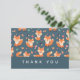 Carte de remerciements avec un motif fait de renards orange mignons et heureux. Arrière - plan vert foncé. Des petits champignons parsemèrent. Message personnalisé à l'arrière.
