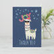 Un panier cadeau de Noël. Conçu avec une drôle d'illustration. Un mignon lama portant des lunettes de soleil noires et un chapeau de santa rouge. Portant également une couverture de style sud-américain et des pom-poms. Le mot Joy écrit au-dessus de sa tête dans une police festive et colorée. Des flocons de neige bleus tombent. Placez-vous sur un arrière - plan bleu. Design fantasque et amusant à thème de Noël. Message sur le dos que vous pouvez personnaliser.