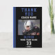 Merci entraîneur carte photo d'équipe de footballeur. Ajoutez le nom de l'entraîneur, le nom du joueur, l'équipe, le numéro et la photo du joueur. Le texte est une typographie blanche et bleue tendance sur un fond noir avec une bande bleue.