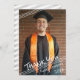 Trois fines lignes blanches en diagonale accentuent le MERCI de titre à lettres, la photo, le nom et l'année de graduation du diplômé. Le dos a un motif rayé gris et blanc muet avec un endroit où vous pouvez ajouter un message de remerciement générique pré-imprimé ou vous pouvez supprimer l'exemple de texte pour laisser vide pour l'écriture de messages personnels ou offrir à votre diplômé certains de chacun. CONSEIL PHOTOGRAPHIQUE : Pour obtenir les meilleurs résultats, choisissez une photo avec le sujet au milieu et/ou pré-recadrez-la à une forme similaire à celle montrée AVANT de télécharger et elle remplira parfaitement l'espace photo. Veuillez contacter le concepteur si vous souhaitez modifier ce design sur un autre produit ou si vous souhaitez coordonner des éléments pour votre ensemble de fête.