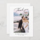 Carte de remerciements mariage simple avec joli script, emplacement photo, noms, date, message, signature et petit coeur sur le dos