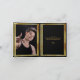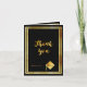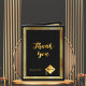 Un carte de remerciements pour un diplômé. Une couleur arrière - plan noire chic et un cadre en faux or. Devant un script de style écrit main et le texte : Merci! Diplômé 20XX (ou toute année). À l'intérieur : Modèle pour Votre note de remerciement et nom Modèle pour Votre photo. Retour : Le texte : Diplômé 20XX, classe de 20XX et le nom de votre école. Un casquette comme décor