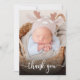 Design Élégant Calligraphie Script Photo Nouveau-né Carte de remerciements bébé. Comprend un beau texte "merci" dans une calligraphie écrite à la main swash tail police script blanc superposition. À l'envers, le message personnel pré-fait en noir et blanc. Idéal pour bébé fille ou bébé garçon. Facile à personnaliser avec votre photo bébé et les détails.