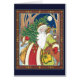 Illustration vintage de Noël représentant le Père Noël portant un arbre de Noël et caressant un cerf qui essaie de manger des fruits et légumes contenus dans son sac. Il porte un sac rempli de jouets et de poupées sur son dos.