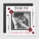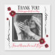 Merci! Customisez un court message et vos noms. Élégant mariage de pavots rouges. Ajoutez un instantané du mariage ou une photo officielle. La carte est vide au dos pour votre message manuscrit. La typographie noire pour le Merci. Amour écrit à la main sur les côtés. Votre message et vos noms en rouge.
