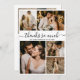 Élégant "Merci tellement" Script Photo Collage Mariage Merci Cartes. Un modèle mariage moderne et minimaliste avec cinq (5) photos à l'avant et une (1) photo à l'arrière. Avec le texte "Thanks So Much" dans une belle main lettrage typographie de police de script en noir sur l'arrière - plan blanc. Costumez votre nom, vos photos et votre message de remerciement. Si vous préférez écrire votre note à la main, supprimez simplement l'exemple de texte pour gagner de l'espace. Veuillez me contacter si vous avez besoin d'aide pour cette conception.