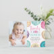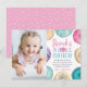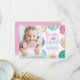 Remerciez les invités de la fête d'anniversaire de votre petit avec ces adorables cartes de remerciement personnalisées, avec "merci un tas" en lettrage pastel, entouré d'illustrations de beignets à l'aquarelle en rose, violet et aqua. Ajoutez un message pré-imprimé personnalisé et une signature, ainsi qu'une photo de la fille d'anniversaire.