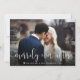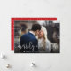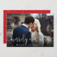 Partagez une photo de mariage préférée ce Noël avec notre carte de vacances joyeusement festive avec "joyeusement toujours après" dans un script de calligraphie moderne blanc et croustillant. Personnalisez avec vos noms et l'année. La carte revient à un motif de neige rouge et blanche en hiver.
