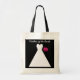 Cette mère du sac fourre-tout de la mariée présente les mots "Mère de la mariée" au-dessus d'une robe de mariée moderne et un bouquet rose de roses sur un arrière - plan noir. Une excellente façon de dire merci à votre mère. Copyright Kathy Henis