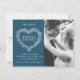 Mistletoe botanique en ligne épicée couronne couronne de coeur dessin bleu et blanc joyeusement marié carte de Noël avec votre propre photo sur un côté. Personnalisez avec votre propre invitation de message à une fête ou un événement post-mariage, les noms, et votre photo. Idéal pour envoyer un peu d'amour comme mistletoe est un symbole d'amour et a des associations avec la vitalité et une bonne santé. Dessin et dessin de ligne d'origine par Sarah Trett pour www.mylittleedenweddings.com seulement sur Zazzle.