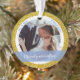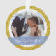 Splashy mais élégant "Merveilleusement toujours après" Notre premier Noël en tant que M. et Mme. [Nom de famille] décoration de Noël personnalisée pour les jeunes mariés, avec typographie moderne cursive / lettrage à la main sur une bande élégante semi-transparente bleue, un cadre de flocons de neige blancs et argentés et de petites étoiles, et un autre cadre de parties scintillant dorée simulée. Assurez-vous de personnaliser au moins les deux photos (avant et arrière), le nom de famille sur le devant, les prénoms et l'année sur le dos.