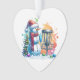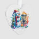 Décor de Noël sur le thème du disque de golf personnalisé. Joli bonhomme de neige en aquarelle à Santa chapeau à côté d'un panier de golf dans la neige à côté d'un sapin de Noël.