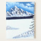 Une scène hivernale calme qui s'étend sous un ciel pâle et argenté. Des montagnes enneigées s'élèvent au loin, leurs sommets adoucis par des nuages à l'abandon.