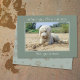 Vous me manquez la carte à partager numériquement. Vous manquez tellement de carte avec du texte personnalisé. Un caniche blanc est recouvert de sable et regarde avec bonheur un ballon sur la plage. En haut, le texte est : "Sans vous, je suis un vrai désordre". Sous l'image, une autre ligne de texte dit : "Vous manquez tellement". Personnalisez le texte comme vous voulez, et changez la photo. Sage couleur verte avec motif empreinte de patte à l'envers.