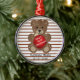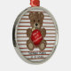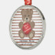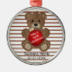Célébrez les premières vacances de bébé avec cet adorable ours en peluche, ornement céramique. Placé contre un arrière - plan rayé sucre de canne est cet ours brun coudu. L'ours tient un ornement rouge qui dit "Le premier Noël du bébé". Vous pouvez customiser ce texte. Sous l'ours se trouve une zone pour un nom et une date.