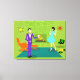 Cette toile en toile tendue moderne en couple du milieu du siècle ressemble à une scène d'une comédie romantique. Le style années 60, minimaliste design d'art, dispose d'un beau couple de dessins animés qui profitent d'une soirée romantique à la maison. La chambre sophistiquée dispose d'un mur en pierre verte et d'un feu rugissant dans la cheminée. Le mobilier de la chambre comprend une orange, un transat avec un repose-pieds assorti, une horloge murale rouge, une étoile, un luminaire jaune Spoutnik et une table ronde orange, qui abrite un lecteur de disques portable vert. Sur le sol à côté de la table d'extrémité, on peut voir un disque vinyle sorti d'une pochette d'album kitschy. Au centre du sol vert se trouve un grand tapis rectangulaire turquoise. Au milieu de la scène, nous avons un couple très sophistiqué. Il y a un homme suave en costume violet, chemise blanche et cravate arc bleu. L'homme grand, sombre et beau regarde son joli compagnon. L'élégante femme aux cheveux raven porte une robe d'aqua gonflable. Ils sont tous munis d'un verre de martini en cristal accompagné d'une olive flottante. Santé! Voici la soirée parfaite à la maison ! *Il s'agissait d'une demande spéciale.