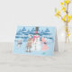 Voici une jolie carte de voeux de Noël que tout le monde dans la famille sourira. Le devant a une image de souris adorables aidant une petite fille à faire un bonhomme de neige, tandis qu'une autre souris passe. Derrière les images se trouve une forêt de pins. Le dessus intérieur a une image correspondante d'un petit lapin lançant une boule de neige sur le bonhomme de neige. Le bas contient des champs de texte personnalisés que vous pouvez facilement intégrer dans votre propre message et signature.