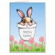Mignonne lapin de Pâques dans une casserole plante et fleurs roses sur la carte d'arrière - plan bleu ciel. Le texte peut être personnalisé pour Anniversaire. Les lapins de Pâques symbolisent renouveau, abondance et bonne fortune.