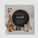 Une scène neutre simple, idéale pour les faire-part de grossesse, avec une girafe mignonne assise à côté d'une carte postale. Grossesse sur les médias sociaux révèle. faire-part de grossesse en girafes, tons neutres, panneau de lettres, minimaliste, élégant révélateur de grossesse, faire-part personnalisable.