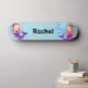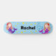 Deux mignonnes petites filles de sirène dans l'eau avec des étoiles de mer et des bulles crée une scène sous-marine ludique sur le skateboard. Idéal pour les enfants qui aiment le skateboard ou qui peuvent servir de mur pour la chambre d’un enfant. Ajoutez un nom ou un texte de votre choix en lettres noires pour personnaliser.
