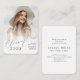 Faire-part et Invitation de graduation simple en noir et blanc avec script chic moderne et photo, simple et élégant. Personnalisez-le avec votre propre photo et les informations de la fête de grad dans le dos.