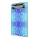 A clipboard featuring a blue and teal bokeh pattern, with round white dots giving it a soft, calming effect. The metallic clip is shiny and reflective.