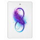 Symbole de l'infini avec une belle plume peinte en couleurs vives violettes et bleues sur fond blanc.