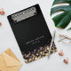 Le porte - bloc noir chic comporte deux lignes de texte personnalisé en lettres blanches modernes, accentuées par des brins croisés de lampes à cordes d'or avec un effet bokeh flou. Le design se répète à l'envers. Veuillez noter que ce porte - bloc est une mini taille; version grandeur nature également disponible dans notre collection Golden Lights.