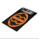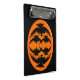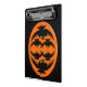 Ce super mini porte - bloc a un ovale orange avec six corneilles dedans. Chaque corbeau a des yeux jaunes avec des élèves noirs et des ailes étirées. Les corbeaux volent vers l'autre formant une forme ovale. L'arrière - plan est noir.
