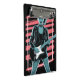 A dynamic, high-contrast vector illustration of a fierce and fashionable female rock star or guitarist. The woman is depicted with a spiky ponytail/mohawk hairstyle, a studded choker, a classic leather jacket, and fishnet stockings. She stands confidently holding an electric guitar. The graphic uses a stylized, limited color palette featuring cool cyan/teal tones for the skin and clothes, contrasted with bold red/pink stripes in the background and a neon pink rectangular frame.