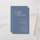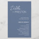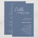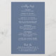 Programme moderne de mariage bleu poussiéreux avec un design simple et minimal avec le nom de la mariée dans un script élégant et le nom du marié dans une police sans serif contemporaine. Vous trouverez ci-dessous, dans le coin inférieur droit, les détails de votre événement et l'ordre de la cérémonie dans un agencement minimaliste. Le dos a votre fête de mariage et message de remerciement.