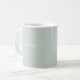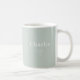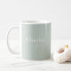 A modern minimalist personalized mug featuring a muted teal background, clean white lettering, and a subtle heart accent. Customized with a name, this design offers a calm, contemporary take on Valentine’s Day gifting while remaining perfect for everyday use.