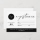 Un élégant certificat cadeau minimal avec un CADEAU POUR VOUS en police décontractée manuscrite associée à une police serif classique avec deux icônes sociales (Facebook et Instagram) et espace pour votre compte social. En bas, une bordure noire avec vos coordonnées complètes en blanc. Notre modèle de certificat-cadeau offre un équilibre parfait entre élégance moderne et personnalisation de la marque. Vous pouvez facilement intégrer votre logo d'entreprise, en vous assurant que votre identité de marque brille par le biais. TOUTE COULEUR DISPONIBLE Si vous avez besoin d'icônes supplémentaires ou de modifications spécifiques, n'hésitez pas à nous contacter à l'adresse citronelladesign@gmail.com avant de passer votre commande Toute entreprise qui souhaite attirer des clients, augmenter ses ventes ou fournir des incitatifs pour des actions spécifiques peut bénéficier de l'utilisation de bons cadeaux dans le cadre de ses efforts de marketing et de promotion. C'est un excellent choix pour les Restaurants et Cafés, les Centres de Spa et de Bien-être, Voyage et Tourisme, des bons cadeaux pour des services comme des massages, des soins du visage et de bien-être.